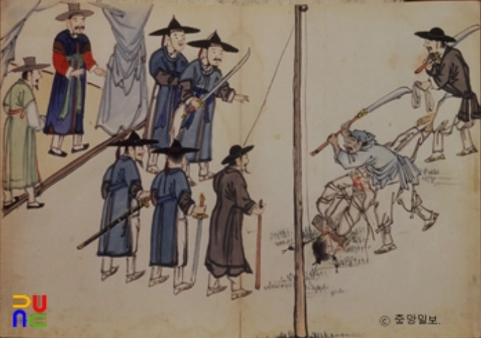 이 그림은 능지와 같은 잔인한 형벌이 시행되던 시기를 잘 보여줘. 당시 사람들의 표정에서 그 상황의 심각성을 느낄 수 있어.