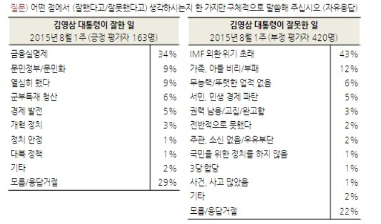 이 표를 보면, 그가 성공한 부분과 실패한 부분이 명확히 나와 있어. 금융 개혁은 34%의 긍정적인 평가를 받았지만, IMF 위기는 43%의 부정적인 평가를 받았지. 이런 점에서 그의 업적이 상대적으로 적다고 평가받는 이유를 알 수 있어.