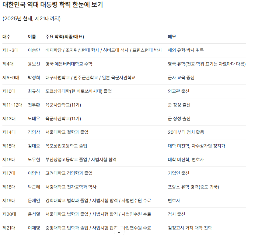 각 대통령의 학력을 정리하여 한눈에 볼 수 있도록 하겠습니다.