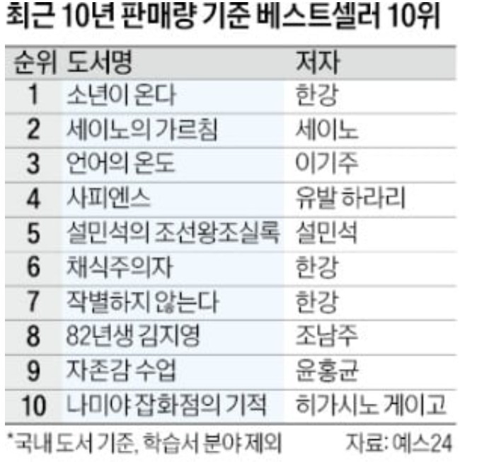 [1] 채널예스 - 최근 10년간 가장 많이 팔린 책은? - 채널예스 (https://ch.yes24.com/article/details/81048)