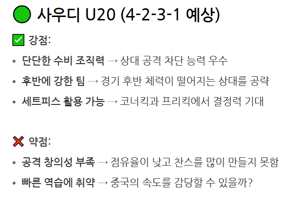 사우디아라비아 U20 팀 역시 아시아에서 강력한 팀으로 알려져 있습니다. 그들은 조별리그에서 1위를 차지하며 4강에 진출했습니다. 사우디 팀은 빠른 공격과 조직적인 수비로 유명하며, 한국과의 경기는 매우 치열할 것으로 예상됩니다.
