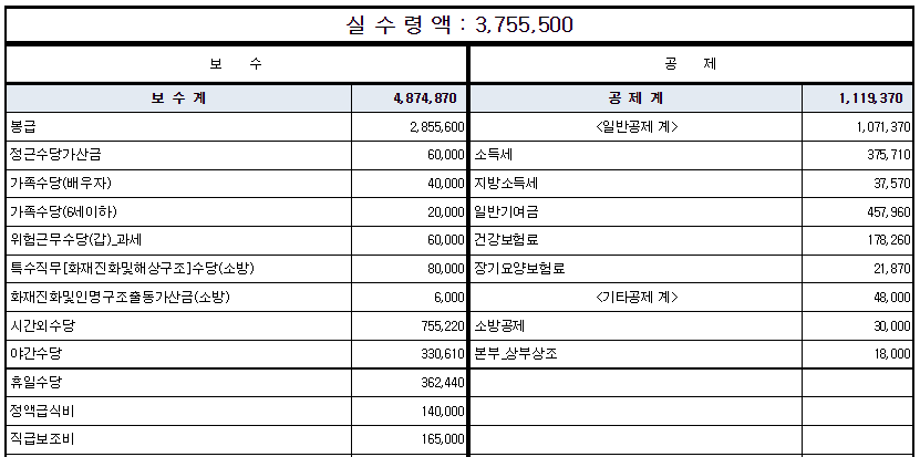 이 문서에서는 소방관의 수당과 공제 내역을 자세히 보여주고 있어.