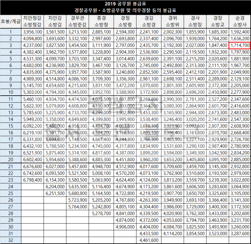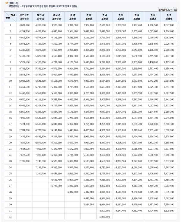 [4] 에듀윌 - 경찰공무원ㆍ소방공무원 및 전투경찰순경 등의 봉급표 (https://eduwill.net/Gov2/Info/Alzza/2014/allzza_popup07_01_07.htm)