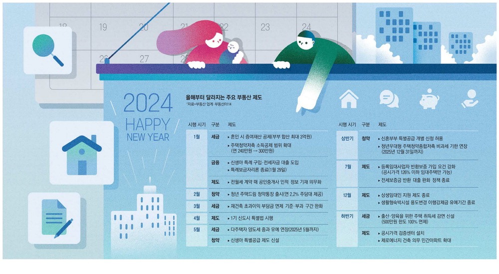 이 그림은 2024년의 주요 부동산 정책과 일정들을 보여주고 있어요. 신혼부부들은 이러한 정보를 미리 알고 준비하는 것이 중요해요.