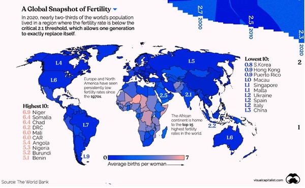 전 세계적으로 출산율이 어떻게 변하고 있는지 살펴보면,