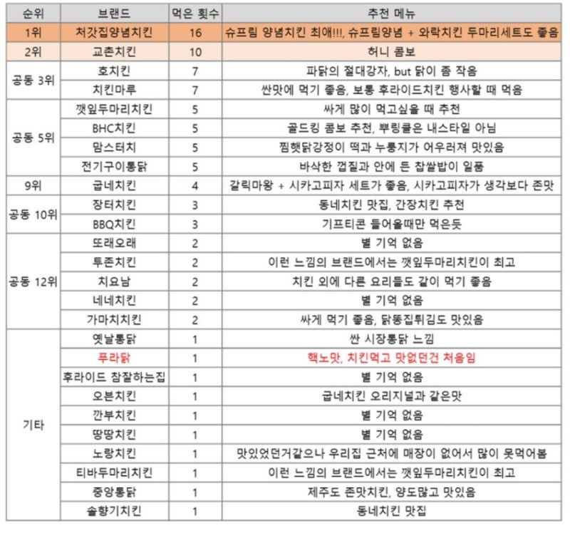 [3] NAVER - 총정리) 치킨 브랜드별 순위 및 추천메뉴, 후기 (※주관 주의) (https://blog.naver.com/43kje/222632343931)