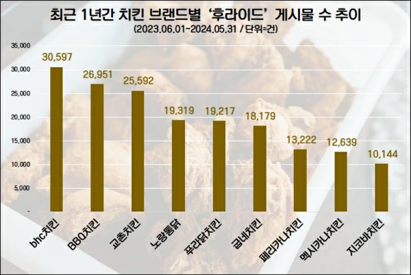 최근 1년간 후라이드치킨 관련 포스팅 수를 살펴보면, bhc치킨이 30,597건으로 가장 많은 포스팅을 기록했습니다.